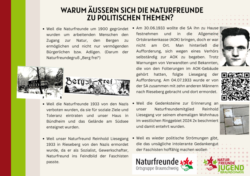 - Weil unser Naturfreund Reinhold Liesegang 1933 in Rieseberg von den Nazis ermordet wurde, da er als Sozialist, Gewerkschafter, Naturfreund ins Feindbild der Faschisten passte.